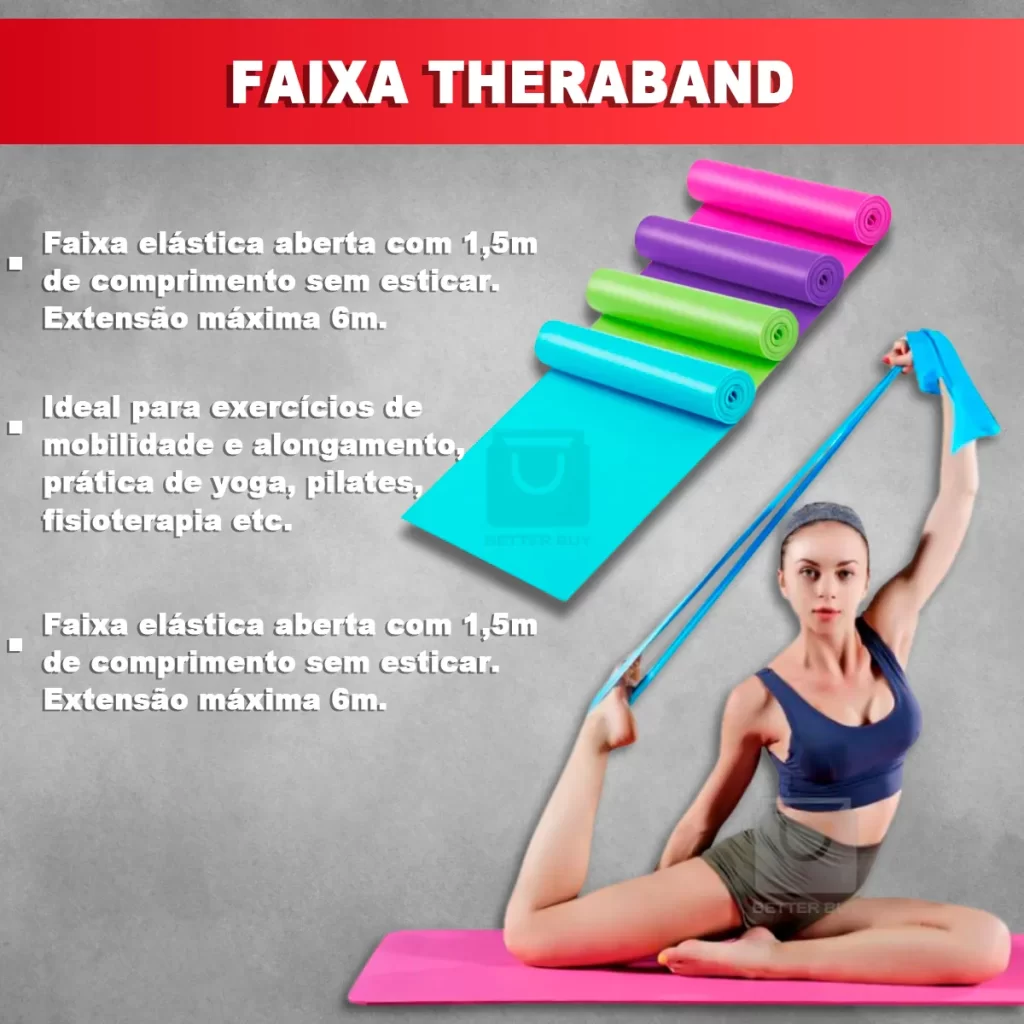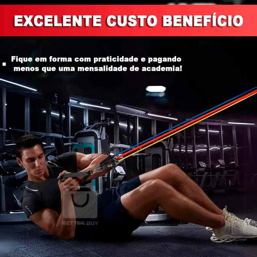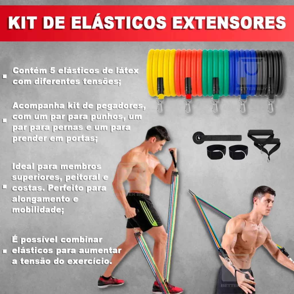 Melhorar Condicionamento físico; >>> INFORMAÇÕES TÉCNICAS > EXTENSORES ELÁSTICOS: * Tensões: – Elástico com mosquetão Amarelo 4,5 kg – Elástico com mosquetão Vermelho 6,8 kg – Elástico com mosquetão Azul 9 kg – Elástico com mosquetão Verde 11,3 Kg – Elástico com mosquetão Preto 13,6 Kg * Comprimento: 1m * Material: Latéx * Todos contém mosquetão nas pontas para encaixe dos acessórios > ELÁSTICOS MINI BAND * Tensões: – Mini Band Verde: 1,8 kg / Espessura: 0,35mm – Mini Band Azul: 3,6 kg / Espessura: 0,5mm – Mini Band Amarelo: 5,4 kg / Espessura: 0,7mm – Mini Band Vermelho: 9 kg / Espessura: 0,9mm – Mini Band Preto: 13,6 kg / Espessura: 1,1mm * Dimensões: 30×5 cm * Material: Latéx > ELÁSTICO CROSS TUBE – Material: Látex, Espuma – Cores: Rosa, Azul – Dimensões: 42cm x 14cm – Nível de intensidade: 7kg > FAIXA DE TREINO THERA BAND – Dimensão: 150×15 cm – Comprimento em extensão máxima: 6 m; – Espessura: 0,35 mm. > CORDA DE PULAR CROSSFIT – Comprimento da Corda: 2,6m, ajustável; – Comprimento da Manopla: 15 cm; – Espessura da Corda: 0,5m;